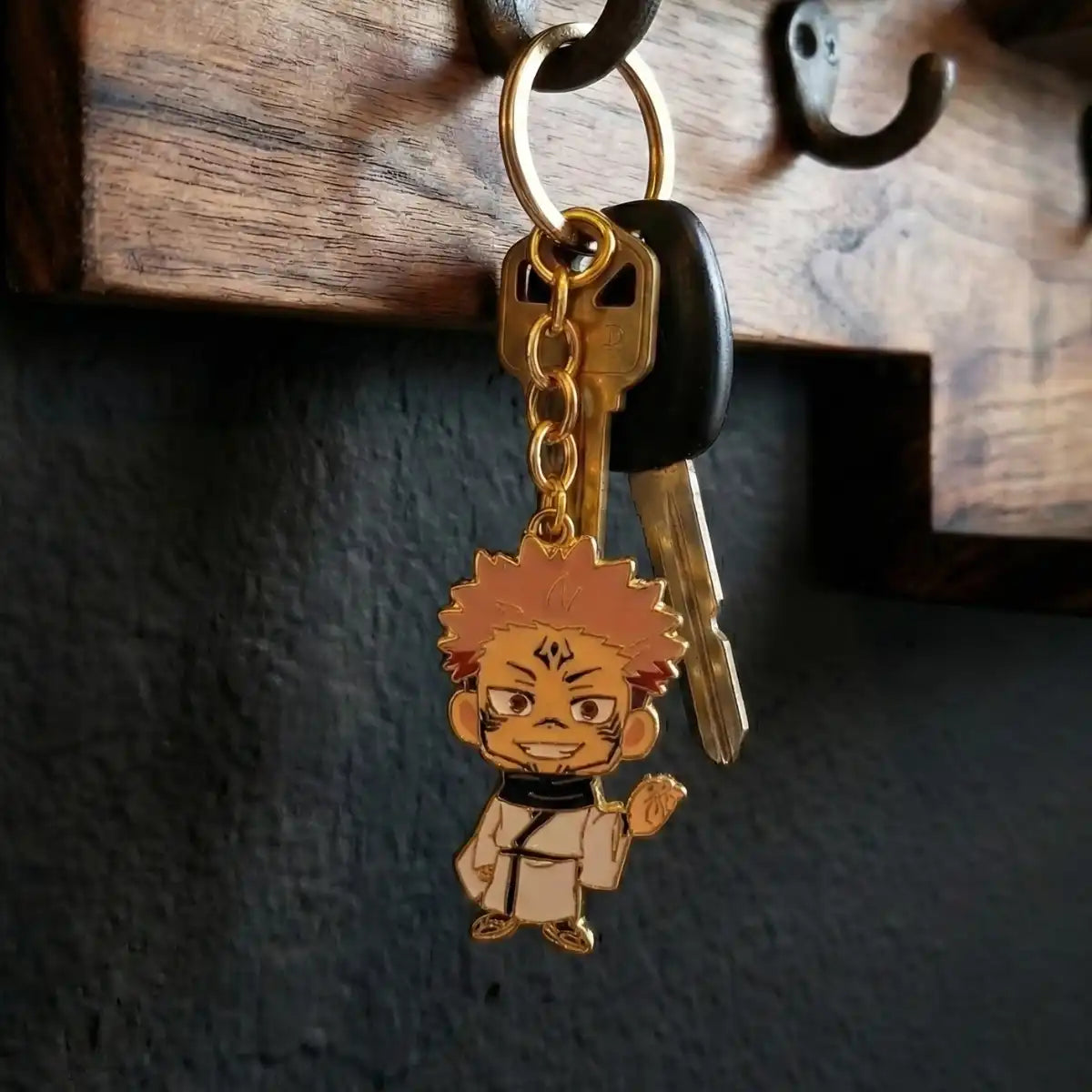Acabado Premium: Olvídate de los llaveros frágiles. Este accesorio está fabricado en metal resistente con un baño tono dorado y un esmaltado de alta precisión que resalta los tatuajes y detalles del personaje. Se siente sólido y pesado al tacto.