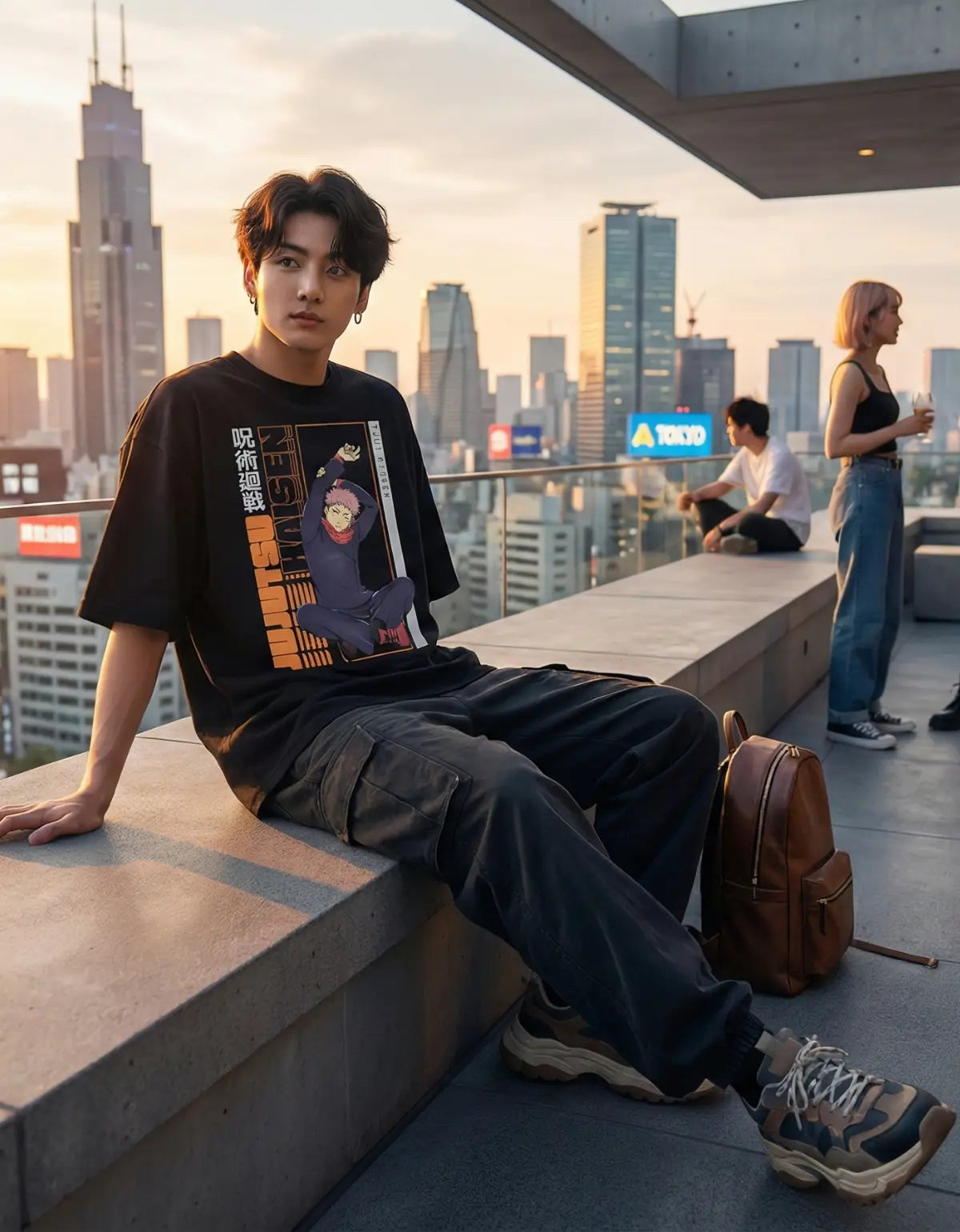 Diseño Impactante: Estampado frontal de gran tamaño con Yuji Itadori en pose relajada y tipografía vertical estilo urbano en contraste naranja y blanco.