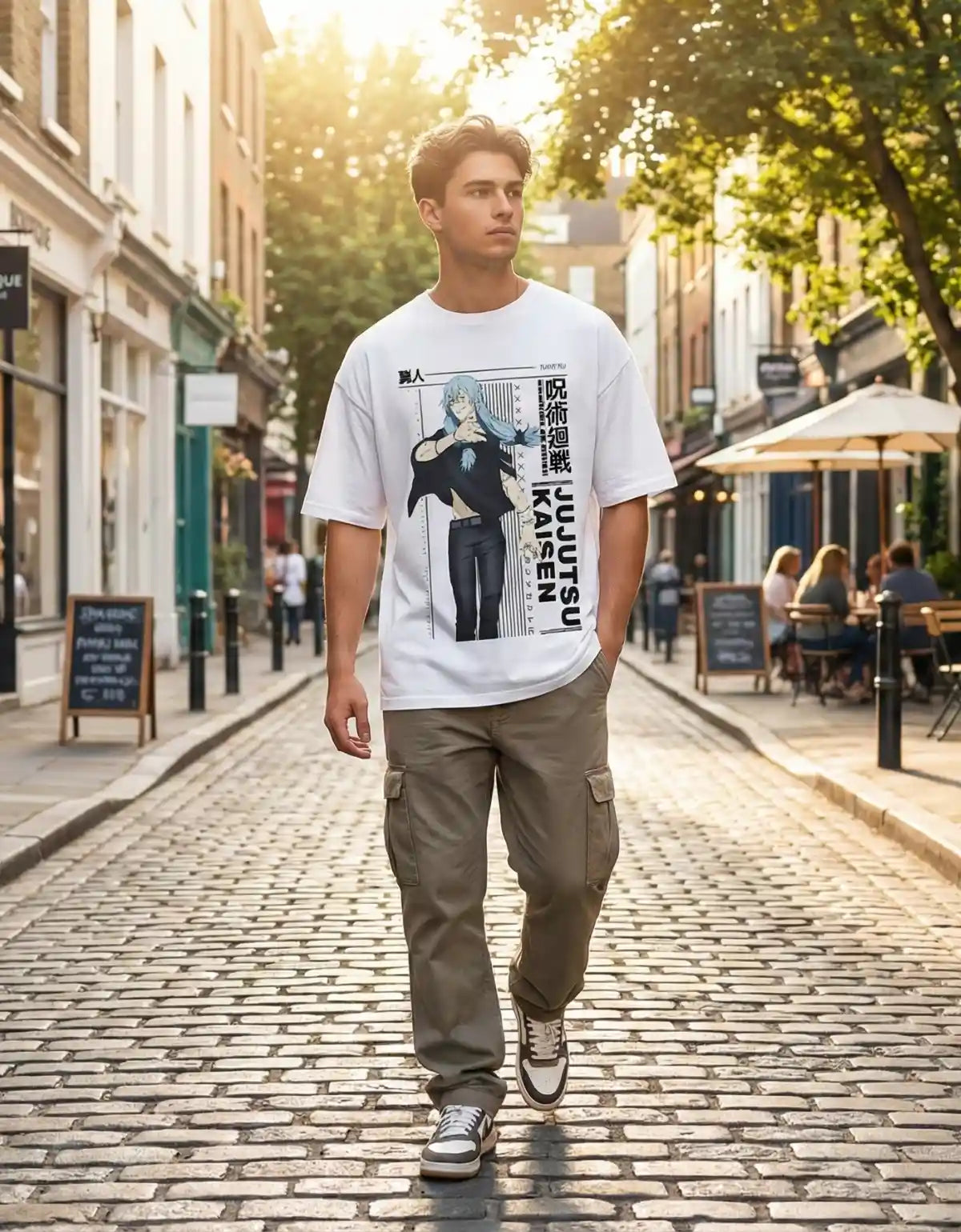 - Diseño High-Contrast: La base blanca de la playera hace resaltar el arte de Mahito y la tipografía vertical estilo manga, logrando un look limpio y llamativo.