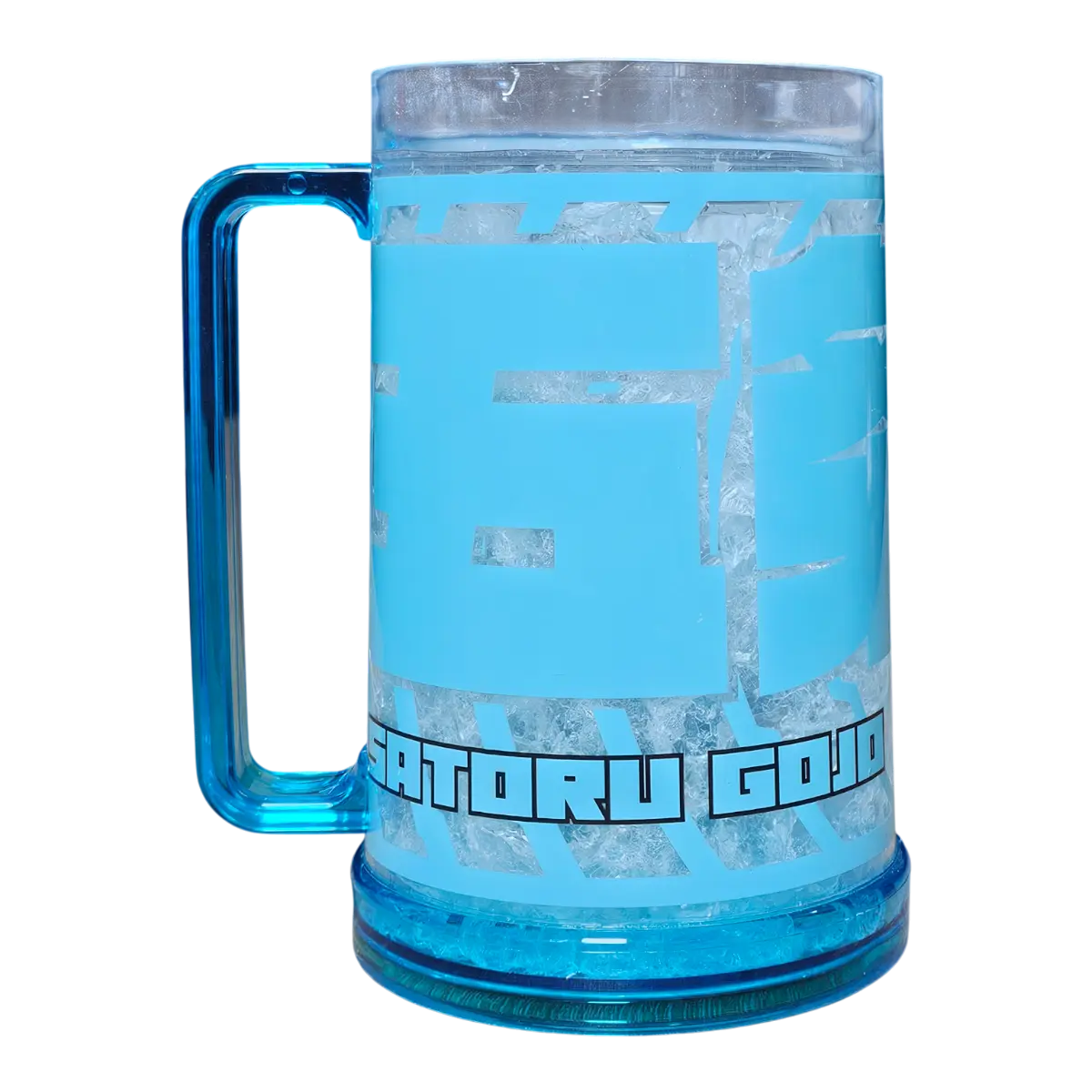 2. Diseño de Satoru Gojo: El tarro luce una impresión de alta calidad de Gojo realizando uno de sus movimientos icónicos, sobre un fondo azul traslúcido que resalta con el efecto del hielo. En la parte inferior, lleva su nombre "SATORU GOJO" en letras grandes estilo manga.