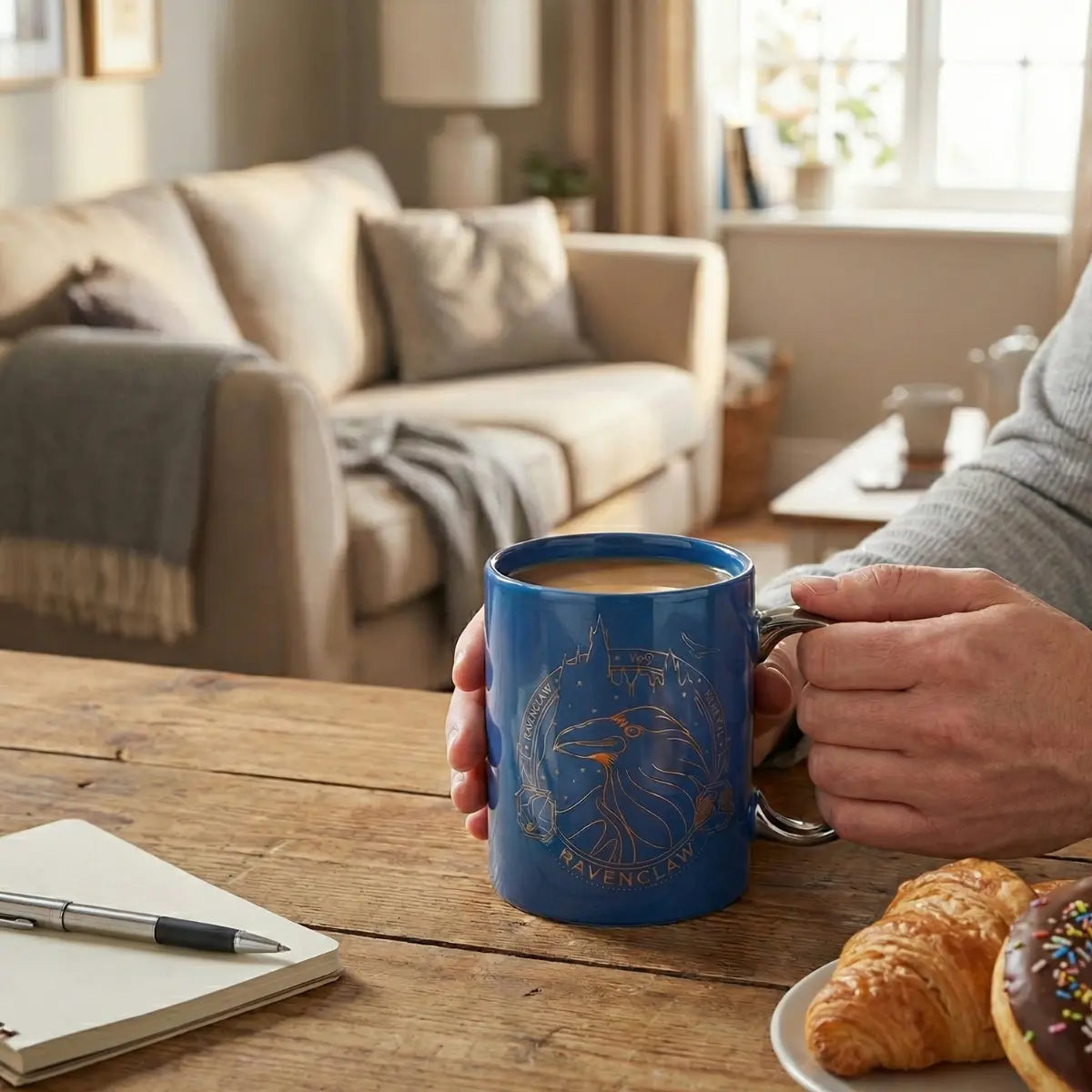 Esta no es una taza cualquiera. Su diseño moderno muestra con orgullo el nombre RAVENCLAW en letras grandes y un acabado metálico que refleja la luz de forma espectacular. En el reverso, encontrarás el icónico emblema del águila rodeado por las cualidades que definen a todo miembro de la casa: "Wit, Learning, Wisdom" (Ingenio, Aprendizaje, Sabiduría).