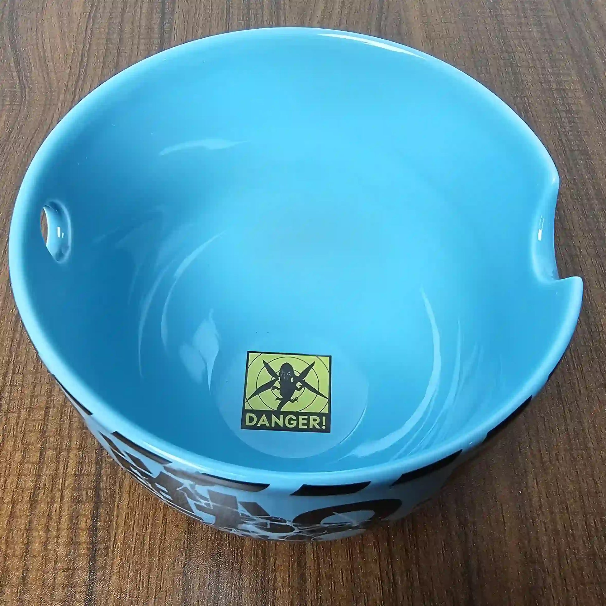 ☢️ Estética "Danger" Industrial: El exterior presenta el icónico azul turquesa con cintas de precaución negras y tipografía japonesa (Kanji). El interior incluye el sello de "DANGER!" en el fondo, revelándose a medida que terminas tu comida.